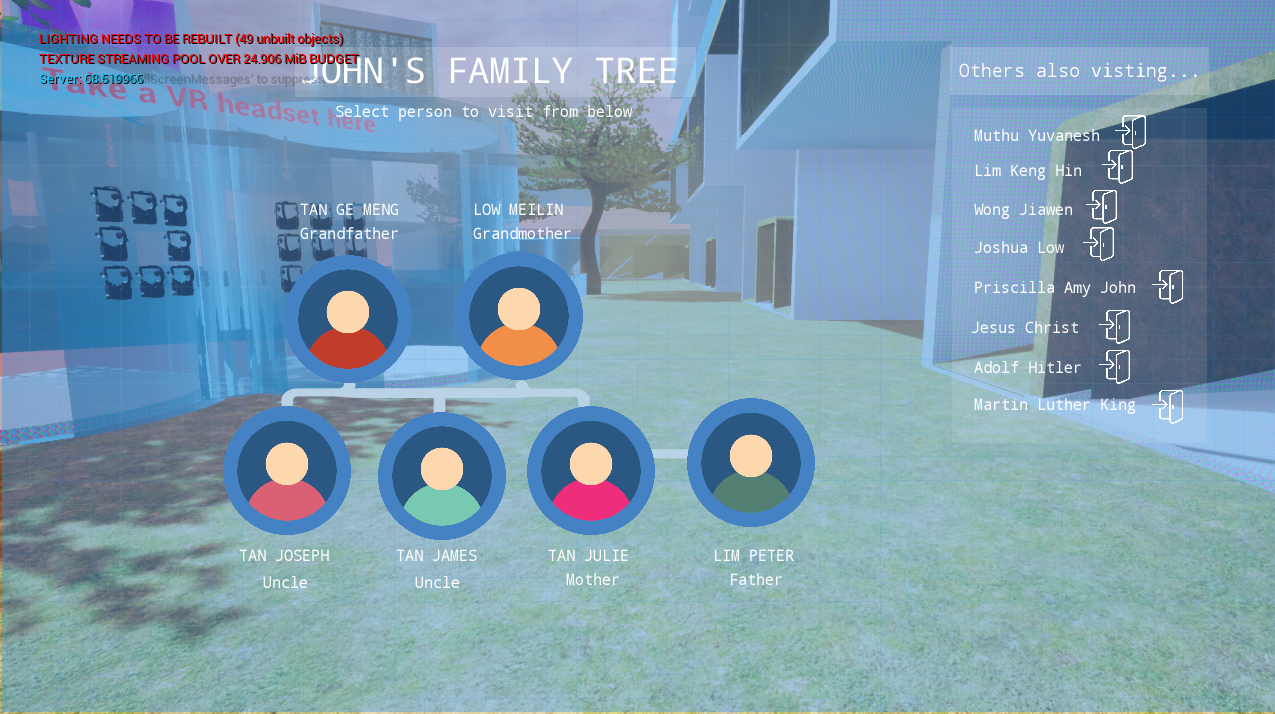 The goggles authenticated his identity and a list of familiar names appeared on the screen. His parents’, grandparents, great grandparents' names popped up on the screen. He chose an available room from the list and visit his father’s altar.